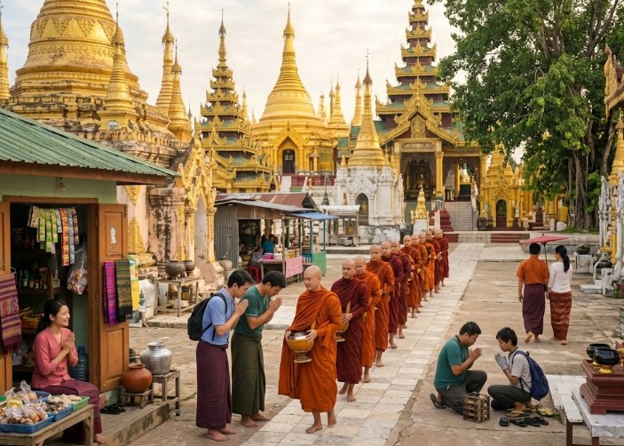 上座部仏教の中核的な教えの一つが「徳を積む(プンニャ)」という考え方です。現世で良い行いを重ねれば、来世で報われるという輪廻転生の思想が深く浸透しており、これが寄付文化や他者を助ける精神に結びついています。寺院への托鉢や寄進は日常的な行為であり、給料の一部を寺院に寄付するミャンマー人も少なくありません。