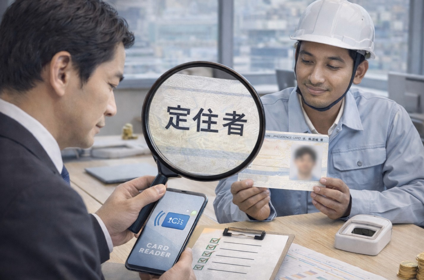 A. 通常は目視+チェックリストで足りますが、違和感がある場合や重要局面では、入管庁が配布する在留カード等読取アプリケーションや番号失効情報照会を組み合わせると、説明可能性が上がります。
